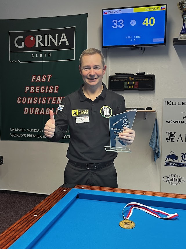 Do finálového zápasu republikového šampionátu lépe vstoupil Martin Boháč. V 11. náběhu vedl již 13:4. Radek ale během čtyř náběhů otočil na 14:16. Do pauzy šel ve vedení znovu Martin Boháč a to v poměru 22:20. Po pauze ale jasně dominoval Radek Novák. V následujícíh osmi nábězích při své návštěve stolu vždy trefil bod. Zápis 4-2-2-2-2-5-1-1. Ve 33. náběhu hrál svůj první mečbol. Suchou malou kvartu ve třetině o kousek minul. V dalším náběhu měl ve třetině strk dlouhý-dlouhý-krátký. Znovu o kousek vynechává. Ve 35. náběhu taktéž velmi hratelná pozice krátký-dlouhý-krátký. O kousek mimo. Martin měl na svém kontě27 bodů a jako by vycítil šanci. Zahrává čtyři body a nechává Radkovi složitou pozici, kterou míjí. Martin má dva body v sérii. Hraje buzar. Jeho koule jen tesně míjí trojku. Píše se 37. náběh. Pozice není snadná. Radek ale vytahuje parádní řešení a proměňuje svůj 5. mečbol!