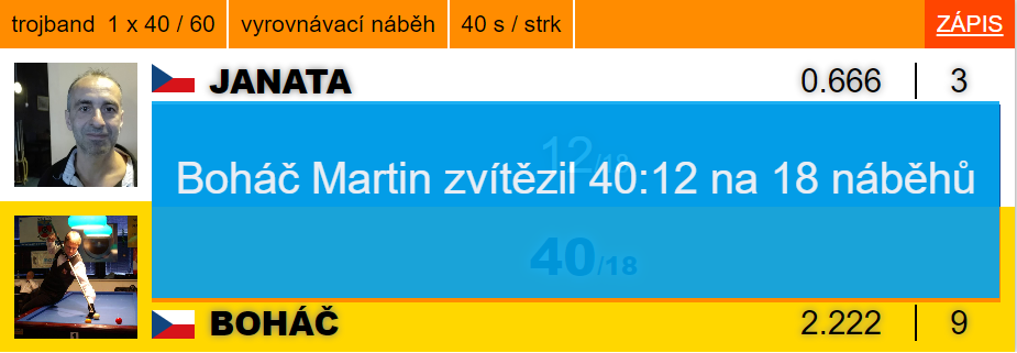 A právě náhradníkovi Bílkovi se vůbec nedařilo. Těsně míjel a toho využíval slušně hrající Jaroslav Peter. Host nakonec zvítězil 34:24 na limit náběhů. Na druhém stole se odehrála tuhá bitva o každý karambol mezi Sibaiem a Křístkem. Domácího hráče bude velmi mrzet poslední bod v 57. náběhu. Na stole byla obrácená kvarta, bohužel však zahrána do tuže. Křístek kontroval jedním a taktéž nedal poslední bod. V 58. náběhu Sibai minul, Křístek nabídnutou šanci využil.