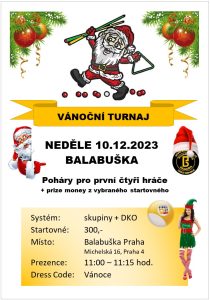 | 10. 12. 2023 | Vánoční turnaj | Balabuška Praha | 300Kč | 9ball | 11:00 |
