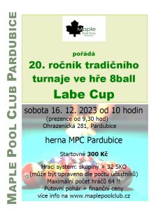 | 16. 12. 2023 | 20. ročník Labe Cup | Maple Pool Club Pardubice | 300Kč | 8ball | 9:30 |