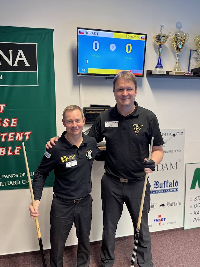 Nasazená trojka Marcel Dirn sehrál napínavý zápas s Milanem Ettelem. Ve 42. náběhu zahrál Milan za stavu 34:33 sérii 3. Následující 4 náběhy ale nedokázal Milan proměnit ani jednu šanci. Marcel tak dostal prostor ze zvratu a ve 46. náběhu dohrál. První seniorská medaile pro Marcela u karambolového stolu. Pavel Škop dokázal držet tempo s Radkem Novákem jen v úvodnu zápasu. Ve druhé polovině byl lepší Radek a ve 42. náběhu zápas dohrál sérií 5. Pavel sice zahrál z dohrávky sérii 6, ale stále mu chybělo 7 bodů k remíze.